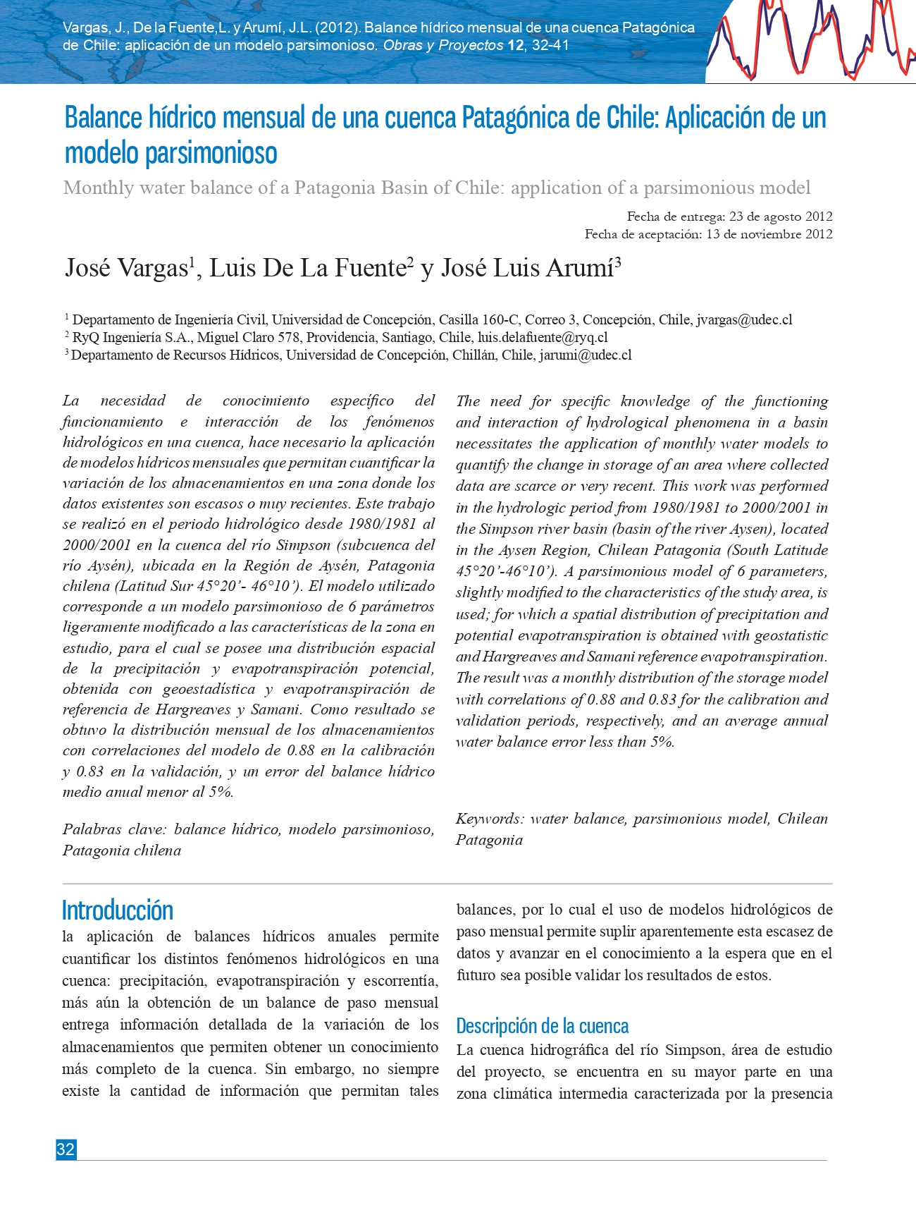 La necesidad de conocimiento específico del funcionamiento e interacción de los fenómenos hidrológicos en una cuenca, hace necesario la aplicación de modelos hídricos mensuales que permitan cuantificar la variación de los almacenamientos en una zona donde los datos existentes son escasos o muy recientes. Este trabajo se realizó en el periodo hidrológico desde 1980/1981 al 2000/2001 en la cuenca del río Simpson (subcuenca del río Aysén), ubicada en la Región de Aysén, Patagonia chilena (LatitudSur 45°20'- 46°10'). El modelo utilizado corresponde a un modelo parsimonioso de 6 parámetros ligeramente modificado a las características de la zona en estudio, para el cual se posee una distribución espacial de la precipitación y evapotranspiración potencial, obtenida con geoestadística y evapotranspiración de referencia de Hargreaves y Samani. Como resultado se obtuvo la distribución mensual de los almacenamientos con correlaciones del modelo de 0.88 en la calibración y 0.83 en la validación, y un error del balance hídrico medio anual menor al 5%.
