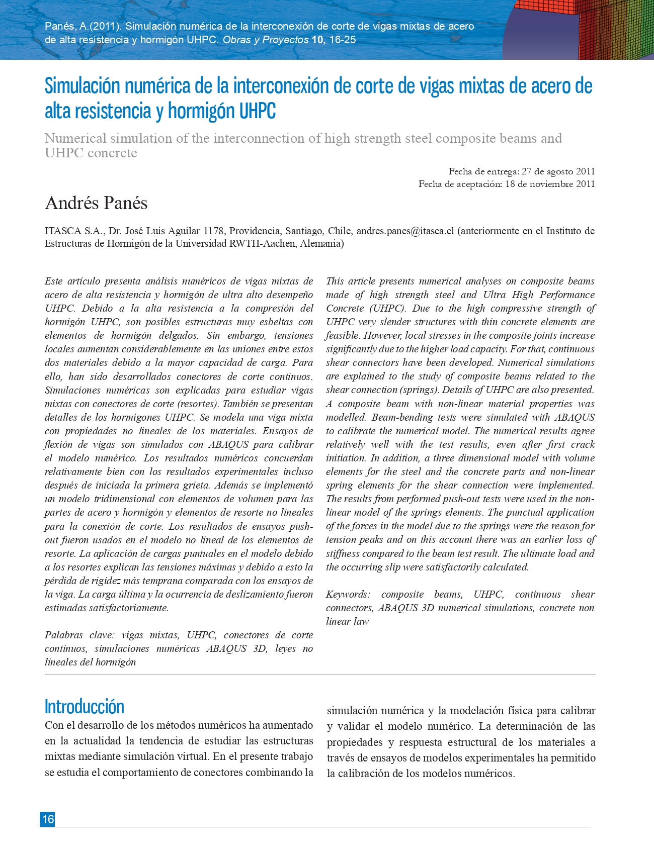 vigas mixtas, UHPC, conectores de corte continuos, simulaciones numéricas ABAQUS 3D, leyes no lineales del hormigónResumen