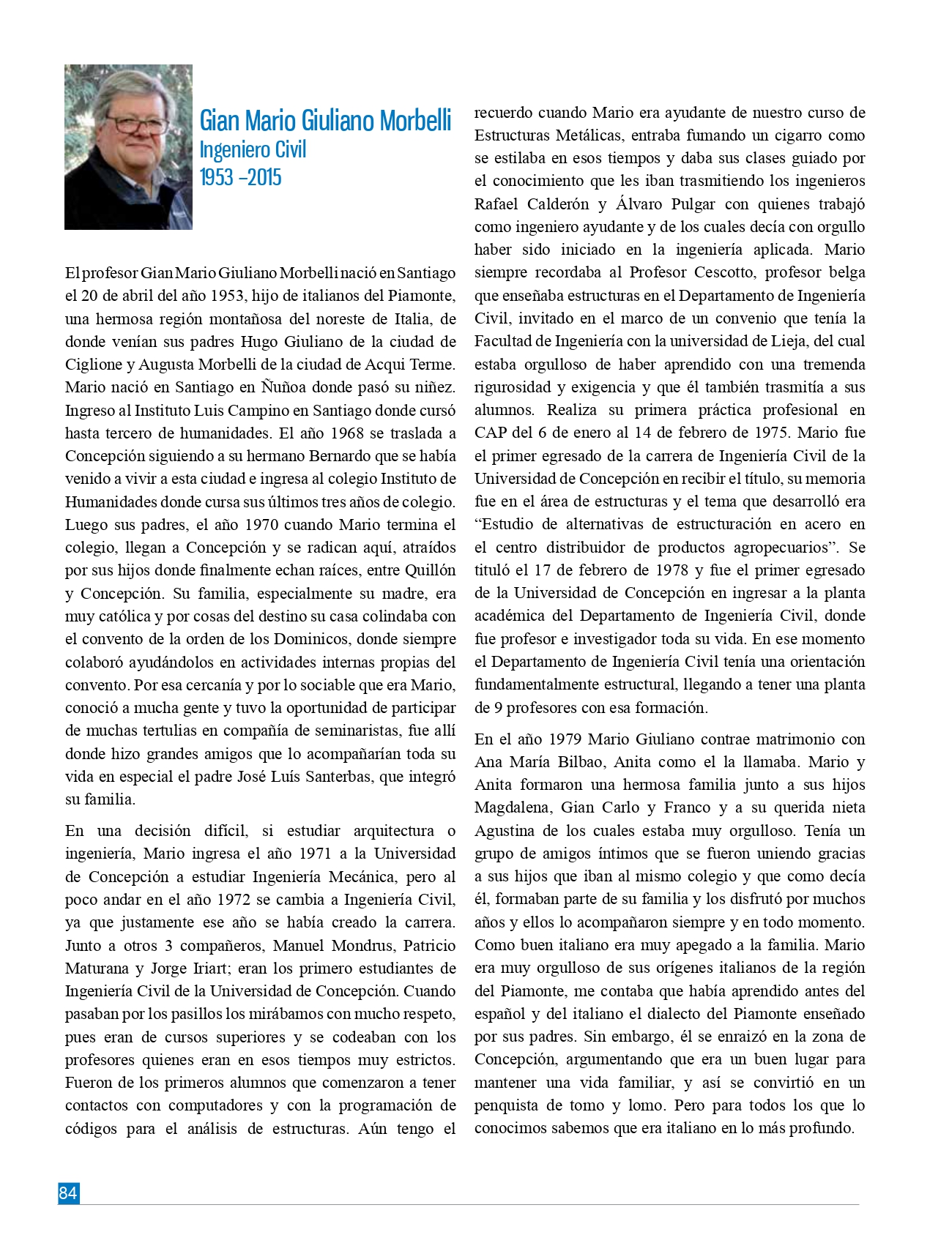 Gian Mario Giuliano Morbelli, Ingeniero Civil, 1953 -2015