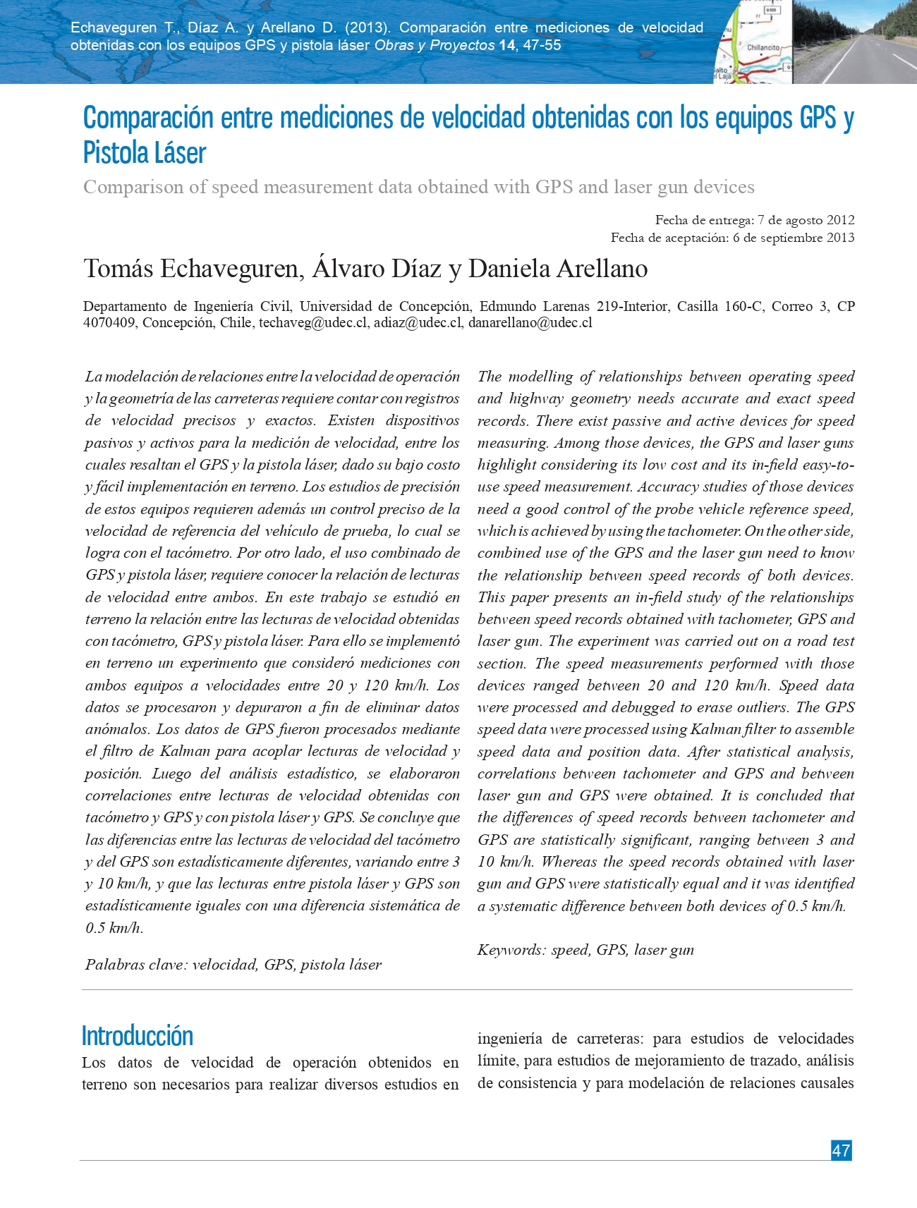 Echaveguren, T. Sepúlveda, P. y Vargas-Tejeda, S. (2011). Evaluación de precisión de mediciones de velocidad de operación en carreteras obtenidas con GPS. XV Congreso Chileno de Ingeniería de Transporte. 3-6 de Octubre 2011. Santiago.