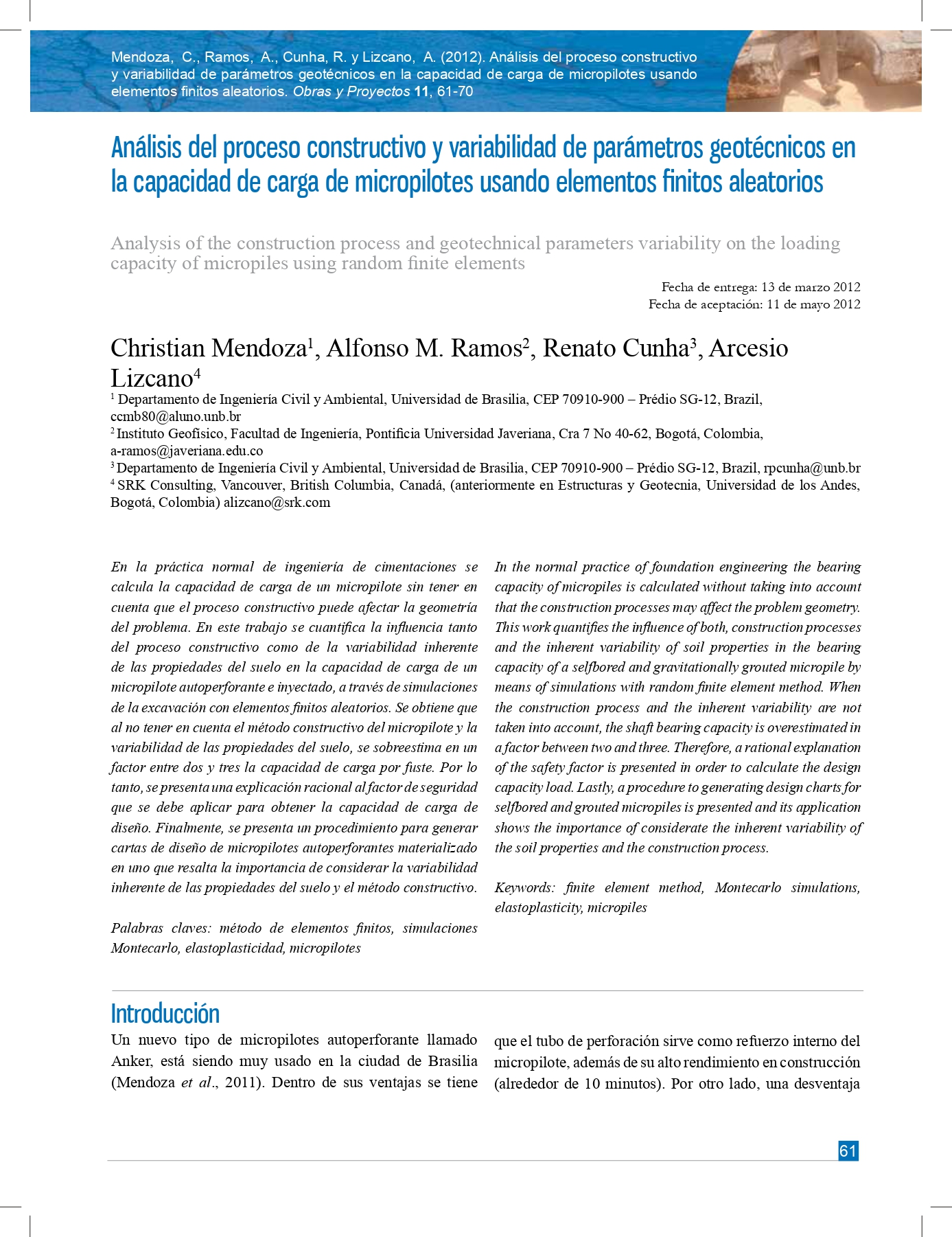 Mendoza, C.C., Ruge, J., Cunha, R. P. y Lizcano, A. (2011). Comportamiento mecánico de excavaciones de pequeño diámetro para suelo estructurado "pilote Alluvial Anker". 14a Conferencia Panamericana de Mecánica de Suelos e Ingeniería Geotécnica. Toronto, Ontario, Canadá .